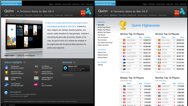 From 2006 until 2013, I worked with German developer Simon Härtel on the website and server/high score database for his very popular Mac OS X game, Quinn. This was an especially fun and valuable project as I was a huge fan of Quinn before meeting Simon and the work came with a plethora of new and interesting challenges (working at a large(r) scale, UTF-8, API programming, HMAC, etc.).